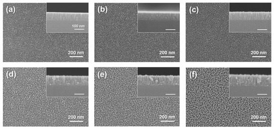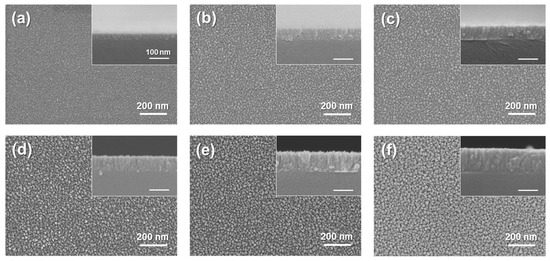 At a higher working pressure (Pworking = 5 × 10−3 Torr) during films preparations, the evaporated TiN atoms presumably lost considerable energy through their numerous collisions with Ar atoms before they were deposited onto the Si/SiO2 <100> substrate, resulting in insufficient growth of TiN film. With decreased working pressure, the surface morphology of TiN film drastically improved with small grain and narrow grain boundary. The insets of Figure 4 presented the cross-sectional microstructures of TiN film. As the working pressure was adjusted, film thickness slightly changed owing to the formation on the target surface a gas compound layer with a lower sputtering rate than metals [22]. Moreover, the cross-sectional images revealed growth morphology containing a columnar microstructure of TiN film at high working pressure, consistent with the characterization of the Zone T structure [23]. At lower working pressure (Pworking ≤ 1 mTorr), columnar structures were not clearly observed, and TiN thin films grew well on the Si/SiO2 <100> substrate.
