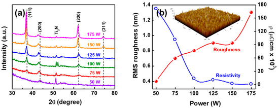 Figure 2 shows the surface morphology of the as-deposited TiN thin films on the Si/SiO2 <100> substrate as characterized by SEM. The TiN thin film deposited at a low source power of 50 W had relatively small dense particles with small void spacing and a smooth and uniform surface, as shown in Figure 2a. With increased source power, the grain size moderately expanded and the grain boundaries increased. This tendency became more obvious at higher source power (150 and 175 W), as displayed in Figure 2e,f. The inset images of Figure 2 show the cross-sectional morphology of TiN film at various source power and confirmed that the thickness of TiN film significantly increased with enhanced source power. The surface morphology of TiN thin film, in each case, was analyzed by SEM measurement for the corresponding sample. XRD study revealed the effect of source power on film crystallinity (Figure 3a). At a low source power of 50 W, only two peaks appeared at 43.6° and 51.2° of 2θ, corresponding to TiN and Ti2N, respectively. With increasing the source power, the peak intensity of Ti2N decreased while the TiN peaks became dominant. Above 100 W of source power, well-developed TiN peaks appeared at 36.8°, 42.7°, 62.1°, and 74.3°, corresponding to (111), (200), (220), and (311) orientation of TiN phase, respectively. A high source power formed a thick film with enhanced diffusion of nitrogen, resulting in predominant TiN phases [18]. However, the TiN peak position shift toward the lower diffraction angles at higher source power suggests the deficiency of the Ti component [19].