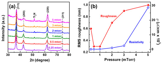 (a) XRD pattern, (b) RMS roughness (Rq) and resistivity of TiN thin film on the Si/SiO2 <100> substrate with various working pressure.