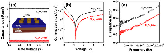 Figure 6a reveals the high-frequency (1 MHz) capacitance–voltage (C–V) characteristic of Al2O3 MIM capacitors of various dielectric thickness, and the inset of Figure 6a shows the schematic of the MIM structure. The capacitance increased as the Al2O3 became thinner, ranging within 3.5–15 fF/μm2. Among the various requirements for an analog MIM capacitor, leakage current density and dissipation factor are critical issues for MIM capacitor applications. Figure 6b shows that 5 nm and 20 nm Al2O3 films exhibited excellent MIM leakage current density (approximately 10−6 A/cm2) at 2 V. The dissipation factor at 1 MHz was also below 0.03 and 0.02 for the 5 nm and 20 nm Al2O3 capacitors, respectively, as shown in Figure 6c.