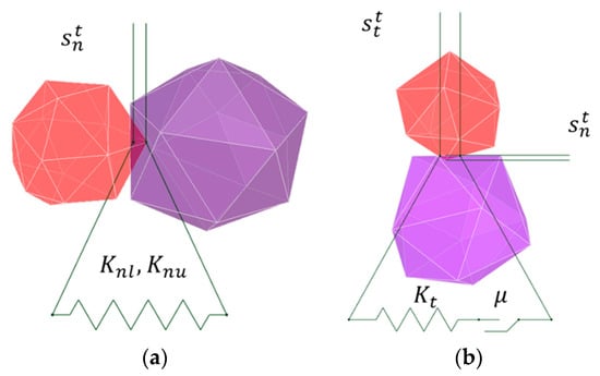 Configurations of particle contact forces: (a) HLS normal force model; (b) LSCL tangential force model.