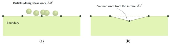 Equation (9) is a numerical model to describe sliding wear. It may be reasonable to express the load caused by the behavior of sliding as a tangential force. In addition, many studies (Finnie et al. []; Zum Gahr et al. []; Rabinnowicz et al. []) have been conducted to define appropriate k values according to the shape of the load or the surface state of the material. Xiangjun et al. [] state that this phenomenological law relates the volume loss of a material to the work performed by the frictional force on the surface of the material. In Equation (9), is proportional to the work done by the friction forces. In this study, Archard’s wear law is defined as the relationship between the shear work and volume lost. Equation (10) explains the amount of wear suggested by Archard’s wear law.