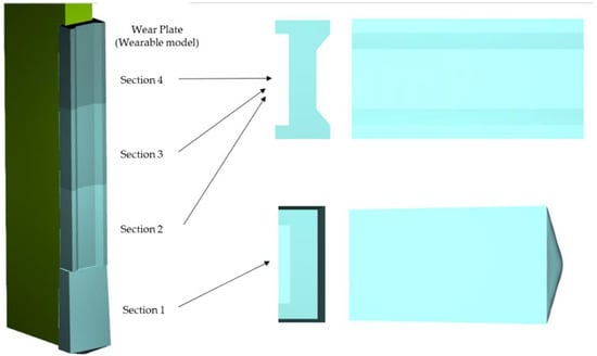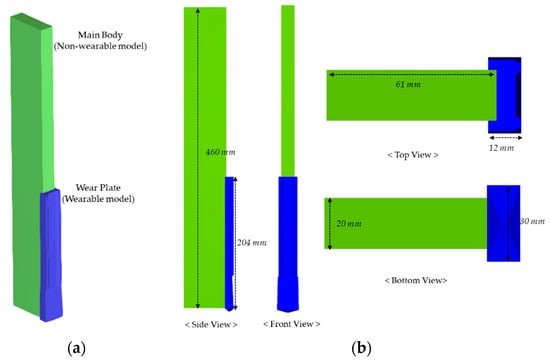 The specimen was composed of the main body and wear part, as shown in Figure 4. The materials of both models were applied with the tungsten carbide cobalt alloy. The main body was modeled as a rigid body to serve as a structure that transmits a load, and the wear plate was modeled to apply the wear assessment. In Figure 4, the main body modeled as the rigid body is marked in green, and the parts defined as the wear body are marked in blue. For the wear evaluation of the model, the cross-sectional loss that occurs during wear was reviewed according to the height of the wear plate part.