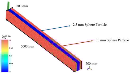 The wear evaluation model was constructed by filling soil particles in a space of 500 mm in height, 3000 mm in length, and 500 mm in width, as shown in Figure 6. The plate model where wear occurs was inserted into the soil, and during the simulation, the plate moved through the soil particle area. From the center of the wear plate, 2.5 mm soil particles were placed in a 300 mm area that was 10 times the width (30 mm), and 10 mm particles were placed in the remaining area to exclude the influence of boundary conditions. In the DEM model, 9,778,480 2.5 mm particles and 305,578 10 mm particles were added as soil particles. The surface grid of the wear plate was smaller than the particles, resulting in a total of 97,110 grids (Figure 7). This is because the load is overestimated when the grid is larger than the particles. The wear plate moving speed was defined as 10 km/h, and the moving distance was defined as 3 m. According to Archard’s wear law, the time interval for updating the worn shape was defined as 0.005 s. Since the individual soil particles causing wear were very small, the particle shape was assumed to be a sphere, as shown in Figure 8.