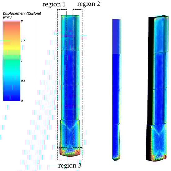 The reference study (Katinas et al. []) showed that the experimental and analysis results were consistent with the lower section, but there was a significant difference at the upper section. The simulation model presented in this study was more consistent with the experimental results in all sections. It also performed relatively accurate evaluations of the wear shape. For the cross-section at 25, 75, and 125 mm evaluated in this study, the protruding area was worn in a curved shape, which is similar to the shape of the experiment. The cross-sectional wear shape at 200, 202, and 204 mm was predicted to be rounded at angular corners, which is similar to the experimental measurement results. Figure 10 shows the shape and amount of wear on the surface of the specimen, and regions 1 and 2 are worn in a rounded shape. It shows that the angular part is worn in a circular shape in region 3, and the amount of wear on the bottom part of the specimen is relatively large due to the compacted particles. The wear evaluation results of each section are shown in Figure 11, Figure 12, Figure 13 and Figure 14. The wear shape predicted in this study was similar to the wear shape measured by the reference study.