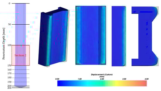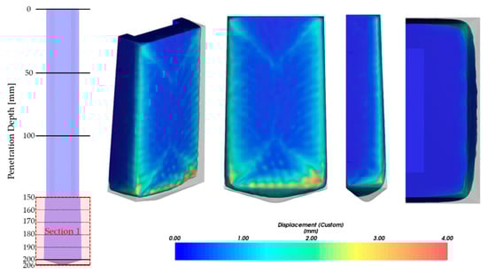 The average, maximum, and total wear amounts for each section of the specimen are presented in Figure 16, Figure 17 and Figure 18. The results of Sections 1–4 show that the average, maximum, and total wear amounts increase as the penetration depth increases. However, Section 4 does not follow the trend of wear according to penetration depth. Section 4 is the area in contact with the free surface of the soil. Since the momentum of a particle on a free surface is larger than that of a stacked particle, the sliding distance of the particle in Section 4 will be large, resulting in a relatively large value for shear work. In the results of this analysis, these phenomena appear. In Figure 16, Figure 17 and Figure 18, the average, maximum, and total values of the wear amount generated in Section 4 are irregular.