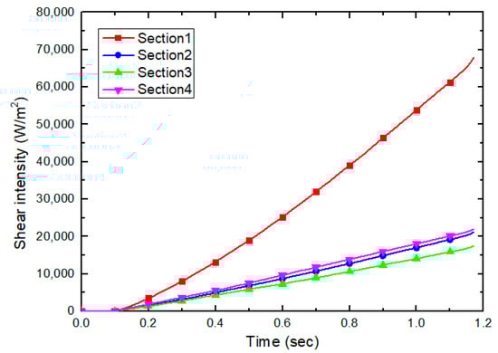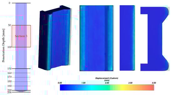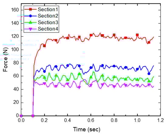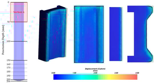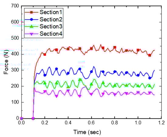 This section summarizes the analysis results of tangential and normal forces that cause wear. The force history is presented for each of the four sections defined above. Figure 19 and Figure 20 show the tangential and normal force history of each section. As the penetration depth increases, the load received from the soil also increases. Since Sections 2, 3, and 4 have the same size and shape, the normal and tangential forces increase in proportion to the penetration depth. Since Section 1 has a different shape and size, the relative motion pattern of the particles is different, so the forces are not proportional to the penetration depth. Furthermore, the total amount of wear for each section was analyzed. The total amount of wear () is proportional to the shear work (), as shown in Equation (13), and the shear work is calculated by multiplying the tangential force () by the sliding distance (). If the sliding distance is in the same condition, the total wear amount is proportional to the tangential force. However, in the wear experiment of the reference study, since Section 4 is located on a free surface of soil, the sliding distance of the particle is larger than those of Sections 2 and 3, as shown in Figure 21. The total normal force and total tangential force of the particle for each section occur in proportion to the penetration depth shown in Figure 19 and Figure 20. However, the history of shear work shows that the shear work in Section 4 is larger than those in Sections 2 and 3, as shown in Figure 22. The ability to visually represent the sliding distance of each particle is limited. Therefore, this study compared the results of shear work with the history of tangential force and normal force and confirmed that the sliding distance was increased in Section 4.