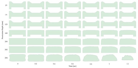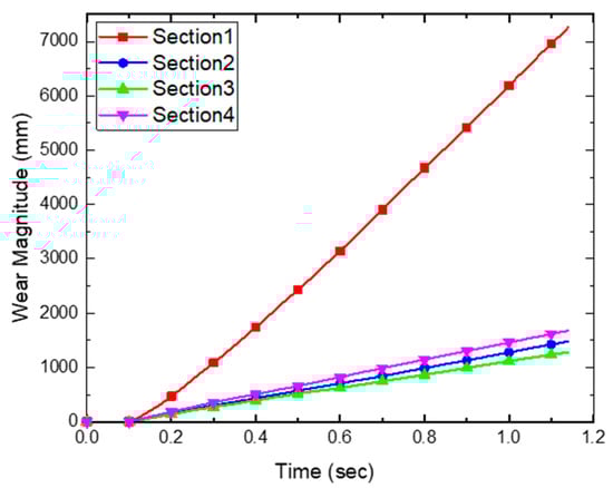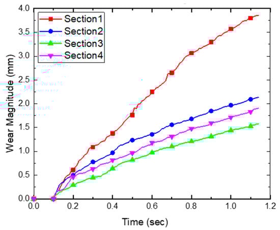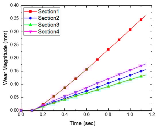 The process of wear shape change according to the movement of the specimen is shown in Figure 15, and the loss ratio for each section is listed in Table 4. It shows that the cross-sectional shape changes nonlinearly in the process of increasing material loss due to wear. This is because the size and pattern of the load generated on the surface of the specimen change because the contact area and shape change due to wear. If the shape change process due to wear is not reflected in the analysis, it can be inferred that the wear shape cannot be accurately predicted because the magnitude and pattern of the load do not change. The change in specimen shape means that the structural boundary conditions of the particles are modified. The shape change process of the specimen also affects the particle behavior, so it should be applied when evaluating the wear.