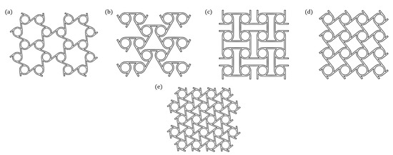 Circular node ring chiral structures: (a) tri; (b) antitri; (c) tet; (d) antitet; (e) hex.
