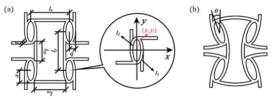 According to Figure 2b and simple geometric relations, it can be found that the E-antitet cell produces a turning angle when the elliptical nodal ring is compressed in the - and -directions, and the length of the ligament being rotated into the nodal ring is the elongation . Thus, the strain along the - and -directions can be expressed as: