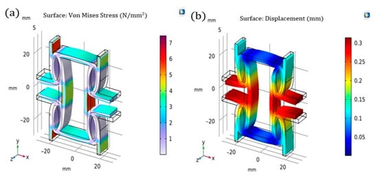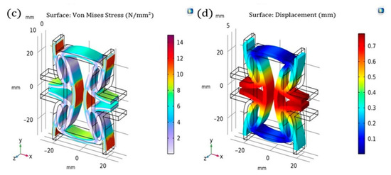 Figure 3 shows the stress and displacement cloud diagrams of the E-antitet cell under compression. The axial ligament always bears the larger stresses and displacements. The Poisson’s ratios and and Young’s modulus and of the E-antitet can be obtained from the FEM simulations either in the -direction or -direction.
