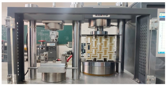 To further verify the correctness of the theoretical derivations and FEM simulations, a 3 × 3 structured E-antitet sample with PLA as the base material was fabricated using a CREALITY 3D printer (Model: CR-6 max) with the fused deposition modeling (FDM) process. The parameters of the 3D printer setting are shown in Table A1 in Appendix A. The parameters of this sample are: , , , , and , which means , , , , , , , and . The 3 × 3 structured E-antitet samples were placed on the SANYU microcomputer electro-hydraulic servo pressure test machine (Model: HYE-300B) for in-plane Poisson’s ratio and Young’s modulus measurements ( steel plates were placed on the top and bottom surfaces of the sample in contact with the pressure test machine), as shown in Figure 4. All in-plane compression experiments were performed at a constant displacement rate of 0.5 mm/min and no more than 3% strain. The horizontal displacements were measured by a SHSIWI digital multimeter (Model: CS-5311F) placed on one side. Finally, the theoretical derivations, FEM simulations and experimental results of Poisson’s ratio for the 3 × 3 structured E-antitet sample are −2.43, −2.08 and −2.48 ± 0.01, respectively, which are shown in Table 2. The error between the experimental results and the theoretical derivations is only 2.10%.