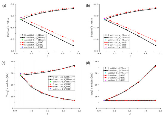 Trends of Poisson’s ratio and Young’s modulus for E-antitet at different δ: Analytical and numerical solutions of Poisson’s ratio for (a) antitet-1 and (b) antitet-2 to E-antitet base cell; analytical and numerical solutions of Young’s modulus for (c) antitet-1 and (d) antitet-2 to E-antitet base cell.