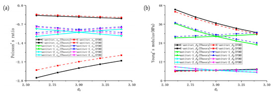 Using the same definition of , Figure 9a,b respectively show the effect of different on the Poisson’s ratio and Young’s modulus of E-antitet, antitet-1 and antitet-2; their detailed results are shown in Table A6. It can be seen that the variation of and has no significant change on the Poisson’s ratio and Young’s modulus of E-antitet, antitet-1 and antitet-2. In fact, we have not found that the thickness of E-antitet in the -axis direction affects the Poisson’s ratio and Young’s modulus in our theoretical derivations, so we speculate that the variation of thickness does not change the Poisson’s ratio and Young’s modulus of E-antitet, which also provides the theoretical basis for our experiments.