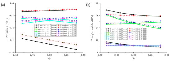 Here, we use the same definition of . Figure 7a,b respectively show the effect of different on the Poisson’s ratio and Young’s modulus for E-antitet, antitet-1 and antitet-2, and their detailed results are shown in Table A4. It can be seen that and of E-antitet, antitet-1 and antitet-2 increase and decrease, respectively, when increases, which means opposite to the trend of . For Young’s modulus, antitet-1 and antitet-2 also show the opposite trend to , which means that and decrease and increase, respectively, when increases, but Young’s modulus in both directions of E-antitet shows a decreasing trend. It is worth noting that the error in the theoretical derivations and FEM simulations of the Young’s modulus of E-antitet is larger when , which means the shorter ligament length in the -direction results in a shorter effective ligament length when the classical beam assumptions in the theoretical derivations are no longer applicable, and thus, a larger error occurs.