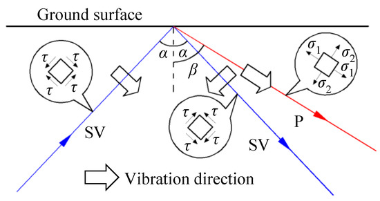 As shown in Figure 1, the plane SV wave with an incident angle α is reflected on the free surface, forming a plane SV wave and a plane P wave with the reflection angle of α and β, respectively. The particle vibration direction of the medium propagating SV wave is perpendicular to the forward direction of the SV wave, and shear deformation of the medium occurs when the SV wave passes through. However, the particle vibration direction of the medium propagating P wave is consistent with the forward direction of the P wave, and the passing of the P wave causes the volume expansion and contraction of the medium. According to the stress balance and displacement continuity, the angle and amplitude amplification factor of reflected wave can be expressed as shown in Equation (1).