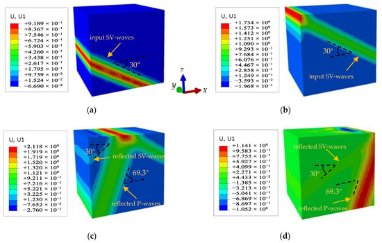 Displacement of half-space subjected to SV wave incidence at 30° (unit: m): (a) t = 0.46 s; (b) t = 0.88 s; (c) t = 1.13 s; (d) t = 1.45 s.