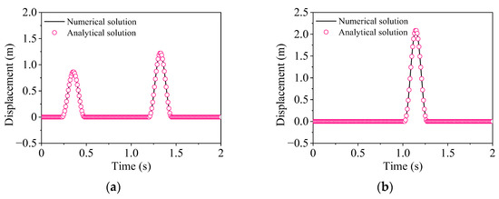 Figure 6 is a horizontal displacement time history tie course of the center point of the surface corresponding to the incident angle. It can be seen that the analytical solution is in good agreement with the numerical solution. The traveling wave effect and waveform superposition are well shown in the diagram. In summary, the numerical simulation for oblique incidence of SV wave has good accuracy [36,37].