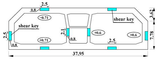 The main project of the HZM Bridge is about 29.6 km long, and the length of the submarine immersed tunnel is about 5990 m, consisting of 33 sections. Each section is assembled with five or eight segments, for a total of 252 segments. The length of each standard section is 180 m, with the maximum buried depth being about 43.6 m. The length, width, height, and lining thickness of the segment are 22.5 m, 37.95 m, 11.4 m, and 1.5 m, respectively. Horizontal shear keys are arranged on the roof and floor of immersed tunnel. The length of horizontal shear key is 2.5 m, the height is 0.8 m, and the extension length is 0.71 m. Vertical shear keys are arranged on the side wall and middle wall, where the height of the side-wall shear key is 2.5 m, the height of the middle-wall shear key is 2.1 m, and the width and extension length of the vertical shear key are 0.8 m and 0.6 m, respectively (Figure 7).