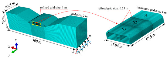 The incident direction of the seismic wave is parallel to the x–z plane and forms an angle α of 0° (vertical incidence), 15°, and 30° with the y–z plane. According to the direction of the axes in Figure 8, the x-, y-, and z-axes refer to the transverse, longitudinal, and vertical directions of the tunnel, respectively.