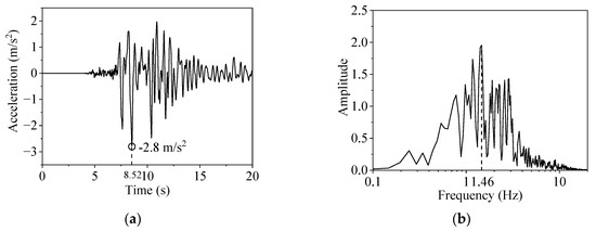 The displacement and velocity time history of the seismic wave can be obtained by integral calculation of the acceleration time history shown in Figure 9, and the corresponding free-field stress can be calculated using Equations (5)–(7). Then, the equivalent nodal force based on VSAB can be obtained by substituting the calculated free-field stress into Equation (10), and the input of seismic load based on VSAB can be realized by applying the amplitude function in ABAQUS. Since there are many nodes in the model boundary, the setting of VSAB and the calculation and application of the equivalent node force can be realized by programming with FORTRAN language.