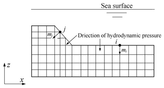 When an immersed tunnel is vibrated by an earthquake, there is an interaction between the seawater and immersed tunnel. At this time, the seawater generates dynamic water pressure on the immersed tunnel; thus, the seismic response analysis of the immersed tunnel is actually a 3D fluid–solid coupling dynamic calculation problem of the structure–soil–fluid interaction system, but the calculation scale considering fluid–solid interaction is huge. In this paper, the additional mass method is used instead of the fluid FEM to simulate the hydrodynamic action of the overlying water. The hydrodynamic pressure of the fluid acting on the surface of the site or immersed tube is approximately equal to the product of the fluid mass per unit area and the acceleration at the active surface, i.e., the additional mass is equal to the mass of the water column above the active area [42]. The direction of the additional mass is the normal direction of the acting surface. As shown in Figure 10, the additional mass acting on the i-node on the horizontal plane is the z-direction, and the additional mass acting on the j-node on the slope is the normal direction of the slope.
