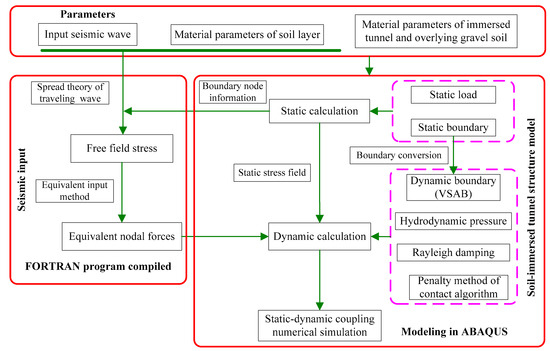 According to the oblique incidence numerical simulation technology in Section 2, the artificial boundary setting and the input of equivalent node load on the boundary can be completed by writing an auxiliary program, so as to realize the simulation of oblique incidence of seismic waves in ABAQUS. Thus, the dynamic interaction of a soil-immersed tunnel under seismic SV wave incidence can be studied. Figure 11 is a flowchart of the entire numerical simulation process. The specific steps are as follows: