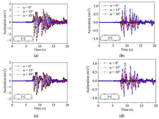 We first compare the acceleration time history of the roof and floor of the immersed tunnel. The roof midpoint and floor midpoint are selected as monitoring points to analyze the acceleration time history (Figure 12).