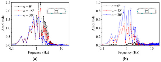 Fast Fourier transform was performed on the acceleration time history of monitoring point to analyze the change in the frequency domain. Figure 13 shows the Fourier spectrum of roof midpoint at different incident angle. The variation law of the spectrum peak amplitude of the monitoring point at different incident angles is the same as the acceleration response. With the increase in incident angle, the horizontal spectrum peak amplitude decreases, and the vertical spectrum peak amplitude increases significantly. Oblique incidence makes the vertical energy increase sharply. When the incident angle changes from 15° to 30°, the dominant frequency of the monitoring point decreases from 1.46 Hz to 0.78 Hz, which may be caused by the decrease in the elastic effect of soil-immersed tunnel system due to oblique incidence. The reduced dominant frequency is closer to the fundamental frequency of the soil-immersed tunnel system, which is unfavorable from the perspective of tunnel seismic resistance and deserves attention.