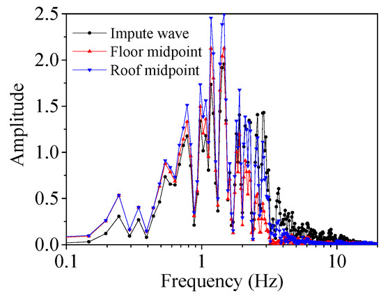 Comparing the Fourier spectrum of the monitoring point with the input seismic wave (Figure 14), it can be seen that the spectrum peak amplitude of monitoring point is amplified, and the spectrum peak amplitude of roof midpoint is greater than that of the floor. The spectrum peak amplitude of roof midpoint is larger than that of the input seismic wave when the frequency is less than 2 Hz, but smaller than that of the input seismic wave when the frequency is greater than 2 Hz. The spectrum peak amplitude of floor midpoint is also the same, but the critical frequency appears at 1.5 Hz. This means that the seismic response of the roof and floor in the frequency domain is similar, but the frequency range at different locations is different. Therefore, seismic design should pay attention to checking the strength of the tunnel roof, as well as consider the impact of oblique incidence of seismic waves to avoid underestimating the seismic response of the tunnel, resulting in damage to the tunnel structure.