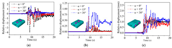 Seismic action may cause global bending or torsion of immersed tunnel, resulting in global tensile deformation and shear deformation of segments, thereby affecting the safety of the tunnel. The central axis node in the three segments of the immersed tunnel was selected to draw the vertical and horizontal displacement curves, as shown in Figure 17. It can be seen that the displacements of segment S1 and S3 are symmetrically distributed. When the incident angle is 30°, the vertical displacements at two ends of S1 are −1.68 cm and −2.04 cm, respectively, which completely correspond to the vertical displacements at both ends of S3. When the incident angle of the SV wave increases, the vertical and horizontal global displacements of the immersed segments increase accordingly. The maximum global displacement in the horizontal direction can reach 3.5 cm (incident angle of 30°), which is 20% higher than the vertical direction, while the maximum vertical global displacement is five times that in the vertical incidence, with the value of −2.04 cm. The global displacement in the vertical direction increases rapidly due to the increase in vertical component caused by the oblique incidence of the SV wave. The vertical and horizontal displacement difference between the two ends of S1 and S3 increase with the increased incident angle, causing the immersed tube to bend vertically and horizontally as a whole. The global bending of the tunnel increases the longitudinal opening on one side of the segment joint, resulting in axial tensile deformation. However, the longitudinal opening of joints needs to be within the deformation range; thus, the joint limit device should be considered in seismic design.