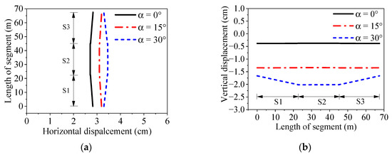 Horizontal and vertical displacements of segment at different angles of incidence: (a) horizontal; (b) vertical.