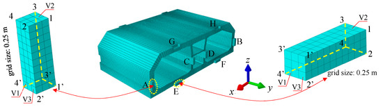 The shearing force of the immersed tunnel is mainly borne by the shear key, which is the main bearing structure to ensure the force and safety of the tunnel. Shear keys, especially the endpoint position and connection position of shear keys, are the key observation positions during the force analysis of a tunnel [43]. The eight shear keys of the S2–S3 segment joint are labeled A–H, as shown in Figure 20.