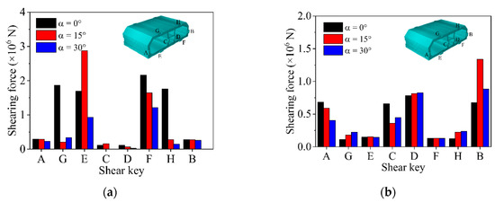 The shearing force (absolute value) at the root of shear key in the numerical model was extracted for analysis, and the calculation results are depicted in Figure 21. The shearing force of shear key is approximately symmetrical, which is related to the fact that the whole immersed tunnel is a symmetrical structure. When the SV wave turns obliquely incident, the symmetrical tunnel shear key is subjected to asymmetrical force, especially the side of the side wall where shear key B is located as the wave front of oblique incidence, making the vertical shear value of shear key B significantly larger than other shear keys. The peak value of vertical shearing force appears at shear key B on the side wall, up to 1.338 × 106 N. The vertical shearing force in the segment joint is mainly borne by the vertical shear key, and the vertical shearing force borne by the horizontal shear key is very small. The vertical shear key bears about 85% of the vertical shearing force, while the horizontal shear key only bears 15% of the vertical shearing force. This is because the horizontal shear key is connected with the outer surface of immersed tunnel, i.e., the horizontal shear key directly contacts the surrounding soil. When the segment is subjected to vertical force, the partial stress of horizontal shear key is released with the extrusion deformation of shear key on the surrounding soil. The peak value of transverse shearing force of the shear key is 2.873 × 106 N, which appears at floor shear key E at an incident angle of 15°. Most of the transverse shearing force in segment joint is borne by the horizontal shear key, while the vertical shear key hardly bears the transverse shearing force, especially the middle wall shear key, which directly penetrates the lining; therefore, the transverse shearing force borne by it is the smallest. The ratio of the horizontal shear key and vertical shear key to bear the transverse shearing force is about 9:1, and the middle wall shear key bears only 2% of the transverse shearing force. The distribution of the shearing force is closely related to the layout direction of shear key in the joint. The layout direction of the shear key in the joint determines the distribution of shearing force at the root of shear key. Both the transverse peak shearing force and the vertical peak shearing force of shear keys occur when the SV wave has oblique incidence. In consequence, each shear key only needs to be checked for the shear capacity of the shear key direction, and the impact of incident angle should be considered.