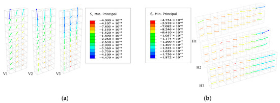 It can be seen from Section 4.3.2 that the peak shearing force in the transverse and vertical directions of the segment joint appears in shear key E and shear key B, respectively. The stress vector diagrams of shear key B and shear key E were extracted for further analysis, as shown in Figure 22 and Figure 23. In order to clearly see the stress vector diagram inside the shear key, the shear key is cut into three entities along the axial grid line. The three entities of horizontal shear key E are marked as H1, H2, and H3, and the three entities of vertical shear key B are marked as V1, V2, and V3. As shown in Figure 20, the plane 3–4–4′–3′ is the root of the shear key, i.e., the position of the shear key connecting to the immersed segment. The corresponding plane 1–2–2′–1′ is the end of the shear key. H1 and V1 are the entities which connected to the main body of the immersed segment. The maximum principal stress in Figure 22 and Figure 23 represents the tensile stress, while the minimum principal stress is the compressive stress. The relative direction of the arrow represents the compressive stress vector, the opposite direction of the arrow represents the tensile stress vector, and the length of the arrow represents the stress value.