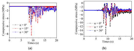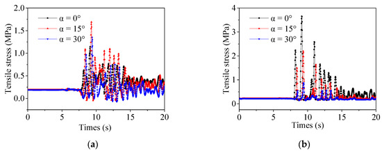 In order to clarify the change in the stress level of shear key with the incident angle, the tensile stress time history of the root node of shear key B and the compressive stress time history of the end node of shear key E were extracted for analysis, as shown in Figure 24 and Figure 25. We can see from the figures that the stress of the shear key experiences severe fluctuations in the period of 7–15 s, and the maximum value appears near 8.52 s, but different incident angles have different time delays. This performance is similar to the fluctuation characteristics of the input seismic wave, indicating that the stress fluctuation on the shear key is mainly affected by the input seismic wave. The initial value of the shear key stress time history is not 0, indicating that the shear key is subjected to a certain static force before the dynamic calculation, which is mainly caused by self-weight and hydrostatic pressure. As the incident angle increases, the stress of vertical shear key B increases, and the stress of horizontal shear key E decreases. The oblique incidence makes the stress distribution of shear key more complicated. This was also mentioned in the previous section, which is related to the change in the horizontal and vertical components caused by the oblique incidence. The tensile strength of concrete material is low; hence, the tensile stress is an important index to evaluate the safety of shear key. The maximum tensile stress of shear key E reaches 3.65 MPa, which exceeds its ultimate tensile strength, indicating that shear key E is damaged. Even if the oblique incidence of seismic waves makes the shear key B produce greater stress, the stress is less than the damage threshold. It can be concluded that the damage of shear key mainly occurs in the root with tensile failure, and the shear key corner stress concentration phenomenon needs attention.