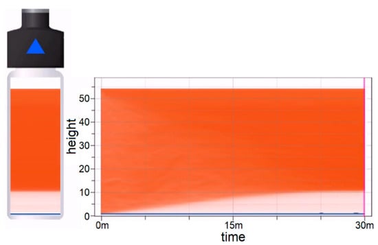 Figure 5c. This explains the fact that for beads of the largest size, a lower height of the sediment layer is ultimately observed compared to the medium sizes. Due to the fact that the sedimentation process took place from the whole volume, the particles closer to the bottom had a greater ease in overcoming this compact structure and therefore fell faster. This is explained by the fact that the sedimentation intensity is higher at the beginning of the process and is lower and lower in further stages.