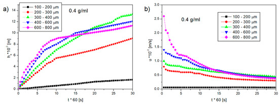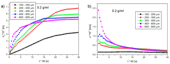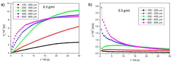 Figure 4b). It can be seen here that initially, the sedimentation velocities take on high values, but as the process continues, these values decrease and eventually take on a fixed value. The trends observed here are further enhanced for the sedimentation process of microspheres with a diameter range of 600–800 μm. Here, a rapid increase in the height of the sediment layer is more clearly observed in the first phase of the process, but smaller and smaller changes are observed over time. Finally, the height of the sediment layer was lower than in the previous case.