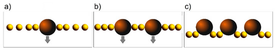 Figure 5b. Then their gravity is high enough to be able to break through the emulsion structure. The emulsion droplets move closer to each other, creating space for the solid to flow. In such a situation, the most intensive sedimentation process occurs, which explains the highest heights of the final sediment layer for medium-sized microspheres (300–400 μm fraction). It might seem that a further increase in particle size, i.e., a corresponding increase in particle weight, would result in an even more intense increase in the sedimentation process, but this is not the case. This is because, in the case of large particle sedimentation, although the weight is large enough to overcome flow resistance, the size of the particles itself becomes important. When they are large, in order to break through the emulsion structure, they cause oil droplets to come as close as possible to each other. These droplets start to form a compact structure. In a limited space, they form a barrier to the flow of solids, as shown schematically in