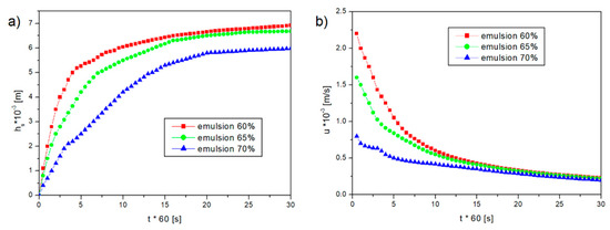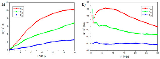 s at time t. Applying Equation (1), it was also possible to calculate changes in velocity u during the process. The graphs of time dependence of h