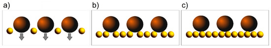 Figure 8b). In this case, the flow resistance is higher. However, there is enough space in the system to create a track for the particles to fall, so sedimentation also occurs in this case. However, when there are very many particles in the system, the oil droplets of the emulsion are so compressed by the particles that they form a barrier for the particles through which they cannot pass. This is schematically illustrated in