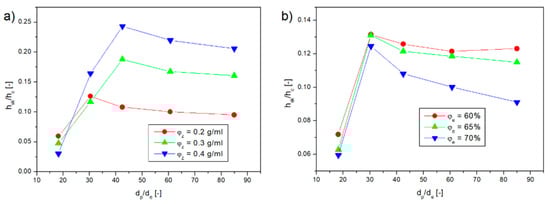 Figure 4a) for different grain size fractions, large differences in the alignment of experimental points can be observed. For the sedimentation of the smallest microspheres with a diameter range of 100–200 μm, the sediment layer growth is mild, and finally, the sediment layer height after 30 min h