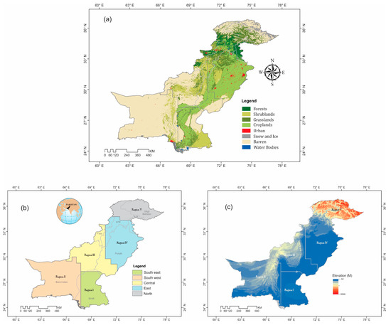 Geographical location of the study region. (a) Land cover types in Pakistan during 2019, derived from the MODIS MCD12Q1 Version 6 data product. (b) Five homogeneous and contiguous regions were developed, which are similar to the climatic regions developed by [13]. (c) Digital Elevation Model based on the ASTER 30 m Digital Elevation Model.