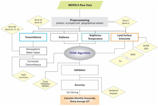 The LST retrieval algorithm (Equation (2) requires three major parts: (1) radiation calibration for the computation of brightness temperature, (2) water vapor content, and (3) atmospheric transmittance based on water vapor. A more detailed description of these parameters and its calculation methodology required for the improved TFSW algorithm can be found in [7,25].