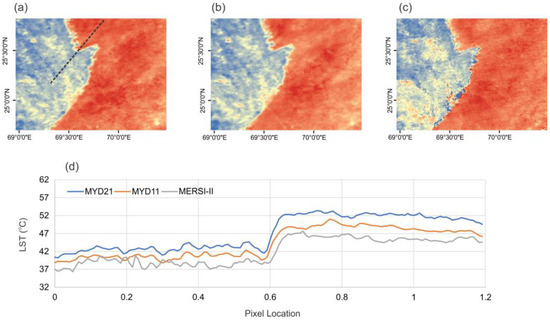 Spatial distribution of (a) MYD11A1, (b) MYD21A1, and (c) MERSI-II LST data. The dotted line represents the profile extraction location. (d) Latitudinal profile of three different LST data.