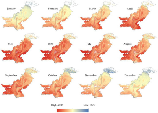 Until now, studies about LST monitoring at the country level are rare, and a few studies have been published regarding LST monitoring at small regional scales such as Mumtaz et al. [17], who examined the spatiotemporal changes in land use land cover (LULC) and investigated its effects on LST using 20 years of data and a CA-Markov model specially for the two urban cities. Arshad et al. [18] reported that the urban land cover of Faisalabad city in Pakistan caused higher regional temperatures according to the result of LULC changes. Similarly, Saleem et al. [19] considered the normalized difference vegetative index (NDVI) as a primary factor of LULC change to identify the role of urban land cover in the context of LST change for the cities of Lahore, Faisalabad, and Multan in Pakistan. From the above literature, it has been observed that most studies have been related to urbanization, and LULC and its contribution to the LST at city levels except for at the country level.