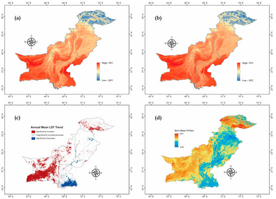 The spatial distribution of the mean LSTs and trend variables. (a) Annual LST in 2005, (b) annual LST in 2018, (c,d) significant increase and decrease along with Sen’s slope from 2005 to 2018.