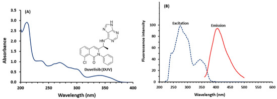 Panel (A): the chemical structure of duvelisib (DUV) and its absorption spectrum. The concentration of DUV was 20 µg/mL in methanol. Panel (B): the fluorescence spectra (excitation and emission) of DUV. The concentration of DUV solution used for recording the spectra was 200 ng/mL in methanol.