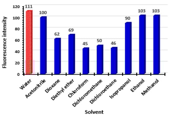 The effect of solvent on the fluorescence of DUV was studied. These solvents were water, acetonitrile, dioxane, diethyl ether, chloroform, dichloromethane, dichloroethane, isopropanol, ethanol, and methanol. The highest and comparable fluorescence intensity was achieved with polar solvents (water, acetonitrile, isopropanol, ethanol, and methanol); however, lower fluorescence intensity was achieved with less/non-polar solvents (dioxane, diethyl ether, chloroform, dichloromethane, and dichloromethane); Figure 2. The varying effects of the solvents on the DUV’s fluorescence intensity were related to the varied potencies of the interactions between the solvents and the DUV. Furthermore, DUV molecules often have non-symmetric dipoles and exhibit varying rates of relaxation in various solvents. Furthermore, the intermolecular arrangement of the fluorophores in the excited state, and possible formation of hydrogen bonding may cause temporal effects on the fluorescence spectra of DUV [30]. Among the better solvents, water was selected as a solvent in all subsequent experiments because it is inexpensive and more importantly it is environmentally and health safety, which imposes a green approach property to the method.