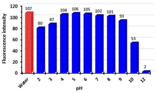 The effect of pH on the fluorescence intensity of DUV was studied by adding Britton–Robinson buffer solution of different pH values (pH 2–12) to the solution and subsequently measuring the fluorescence. The results (Figure 4) indicated that the highly acidic (pH 2–3) and highly alkaline (pH 10–12) solutions had a quenching effect on the fluorescence intensity of the DUV solution. These effects were attributed to either protonation of the nitrogen atoms of the fluorophoric moiety in the DUV structure (Figure 1) at high acidic pH values or a possible degradative effect on the entire structure at high alkaline pH values. The fluorescence quenching effect due to the protonation of nitrogen atoms in acidic pH was due to the delocalization of electrons on the fluorophore and accordingly decrease their liability for excitation by the exciting light wavelength. Besides, the documented effect of pH on the inter- and intra-molecular interactions [31]. The highest fluorescence intensity was achieved at pH values in the range of 4–9. The achieved fluorescence intensities using a buffer solution (pH 4–9) were almost comparable to that achieved using a water DUV solution without buffer. Accordingly, all the subsequent experiments were carried out without adding a buffer solution to the DUV solution. This added advantages to the procedures such as less cost, eco-friendly, and health safe.